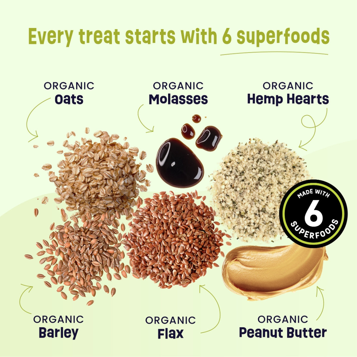 Hemp Protein*, Barley*, Oat Flour*, Flaxseed*, Peanut Butter*, Cane Molasses*, Coconut Oil*, Peanut Flour*, Chamomile*, Valerian Root*, Ashwagandha*, Sunflower Oil*, Rosemary Extract*, Mixed Tocopherols, Sunflower Lecithin*