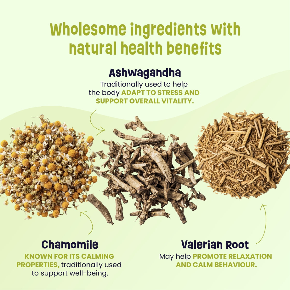 Gruffies Calming is a specially formulated dog treat designed to provide daily support, helping your dog build resilience against stress and anxiety. Infused with the natural power of ashwagandha, a renowned adaptogen, plus valerian root and chamomile, these treats promote relaxation and calm. For optimal results, give your furry friend Gruffies Calming every day to support their ability to manage stress and maintain a peaceful state of mind. With regular use, your dog will enjoy more balance and comfort in their everyday life.