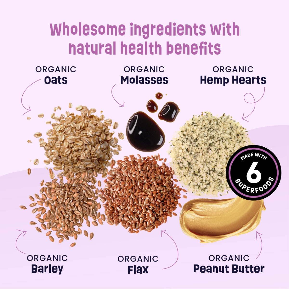 Hemp Protein*, Barley*, Oat Flour*, Flaxseed*, Peanut Butter*, Cane Molasses*, Coconut Oil*, Peanut Flour*, Sunflower Oil*, Rosemary Extract*, Mixed Tocopherols, Sunflower Lecithin*